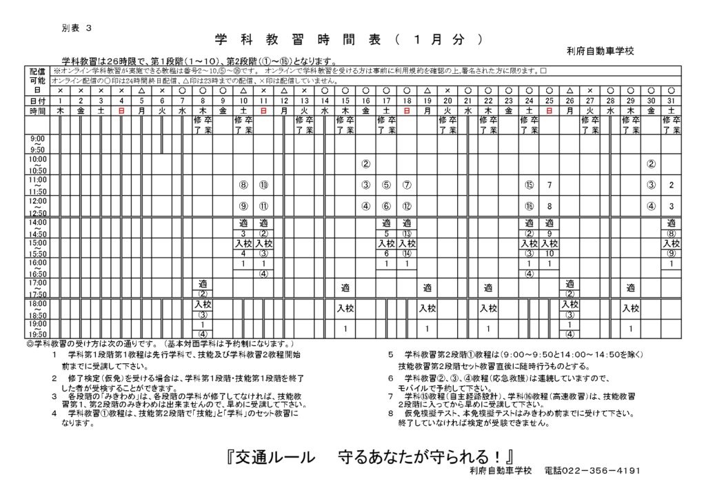 オンライン学科教習時間表(2026年1月分)