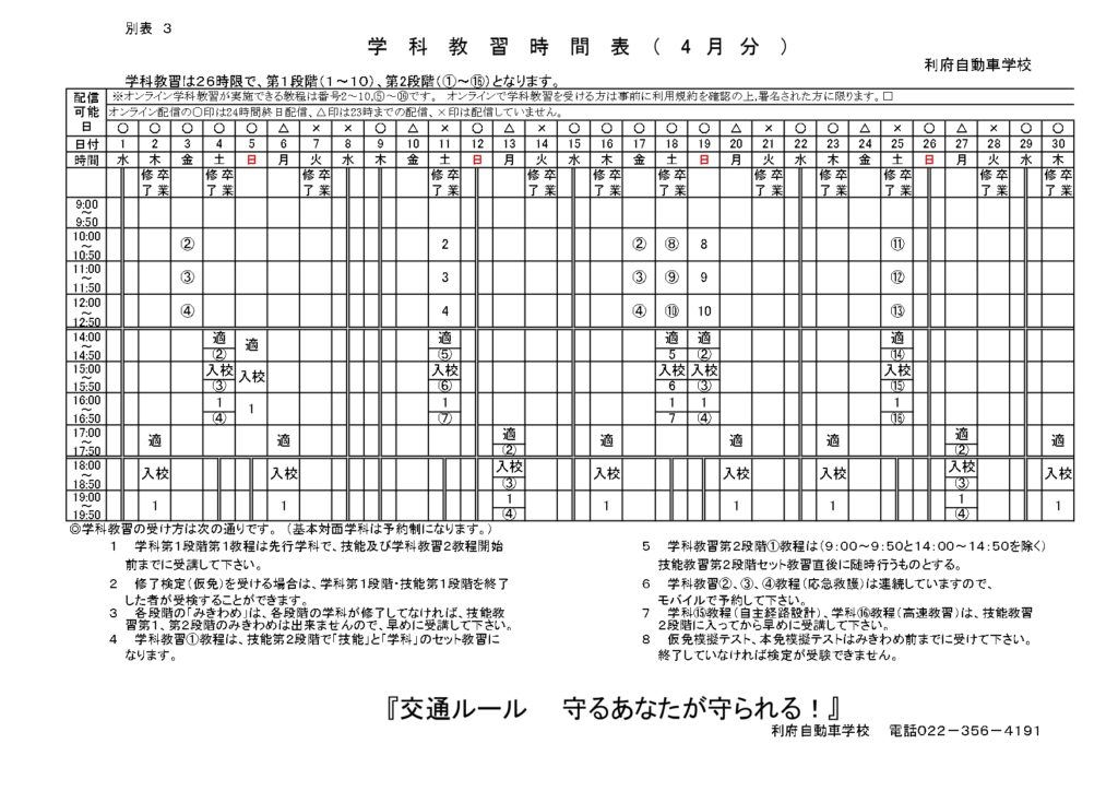 オンライン学科教習時間表(2026年4月分)